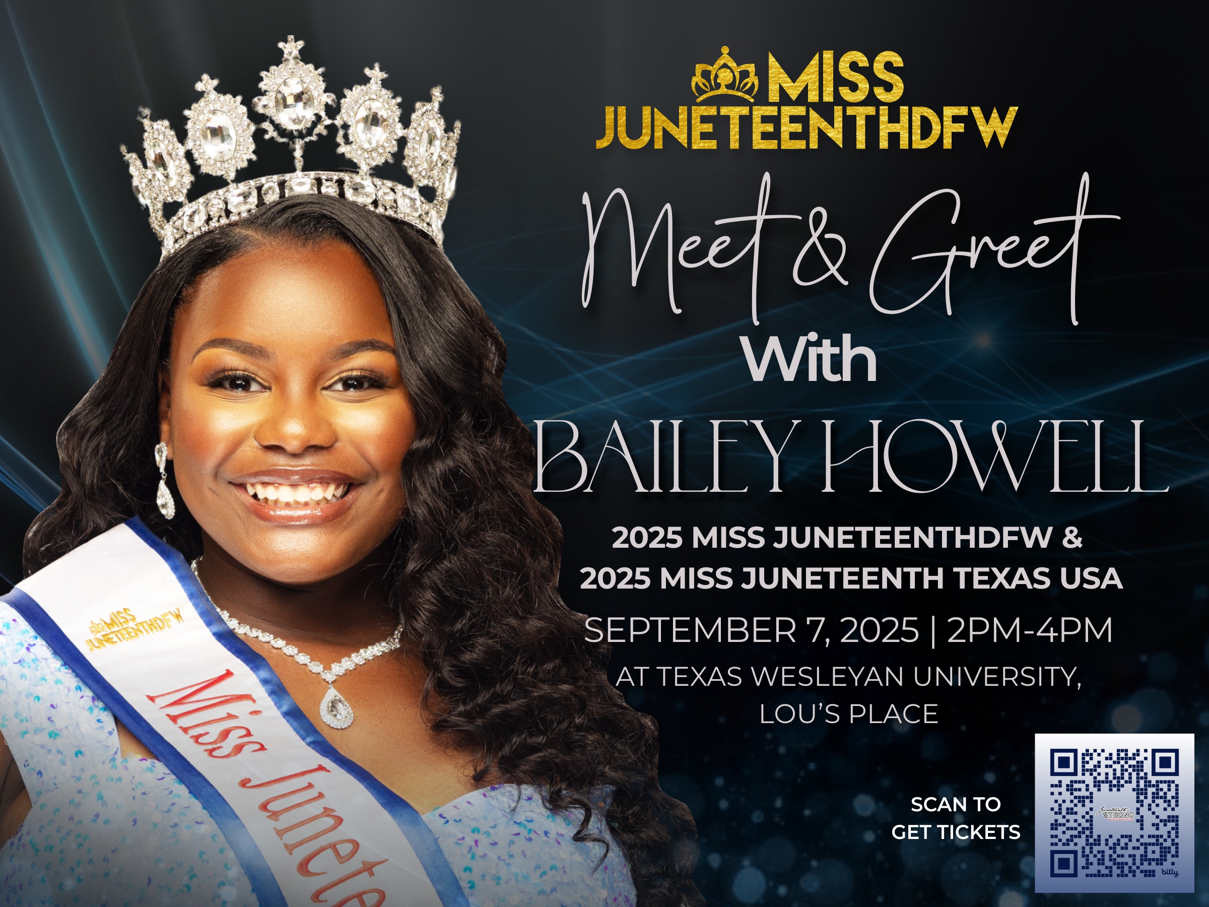 When September 7, 2025 2:00 pm - 4:00 pm Add To Calendar Download ICS Google Calendar iCalendar Office 365 Outlook Live Bookings Bookings closed Where Texas Wesleyan University , Lou’s Place Texas , Forth Worth, United States, 76105 Map Unavailable Register to be part of the reigning Miss JuneteeenthDFW & Miss Juneteenth Texas queen, Bailey’s meet and greet session Bookings Bookings are closed for this event.